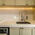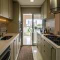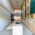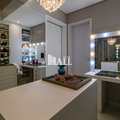 Cozinha estilo americana rica em moveis planejados com cooktop, forno e coifa.