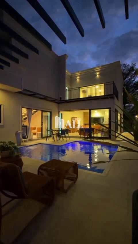 A residência dispõe de três suítes, lavabo e banheiro externo próximo à piscina, ampla sala de estar, sala de cinema, escritório e academia privativa. A cozinha gourmet é perfeita para preparar e servir refeições com estilo, enquanto a lavanderia e o quarto de máquinas garantem funcionalidade. A sacada proporciona vista para a área externa, ampliando a sensação de contato com a natureza e lazer.
